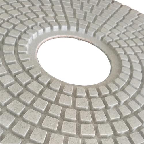 A full-size 17” / 430mm resin-bond diamond polishing pad designed for wet polishing on concrete and hard surfaces. Resin-bond diamond pads are commonly used to refine the surface and improve clarity/shine as you step up through grits.